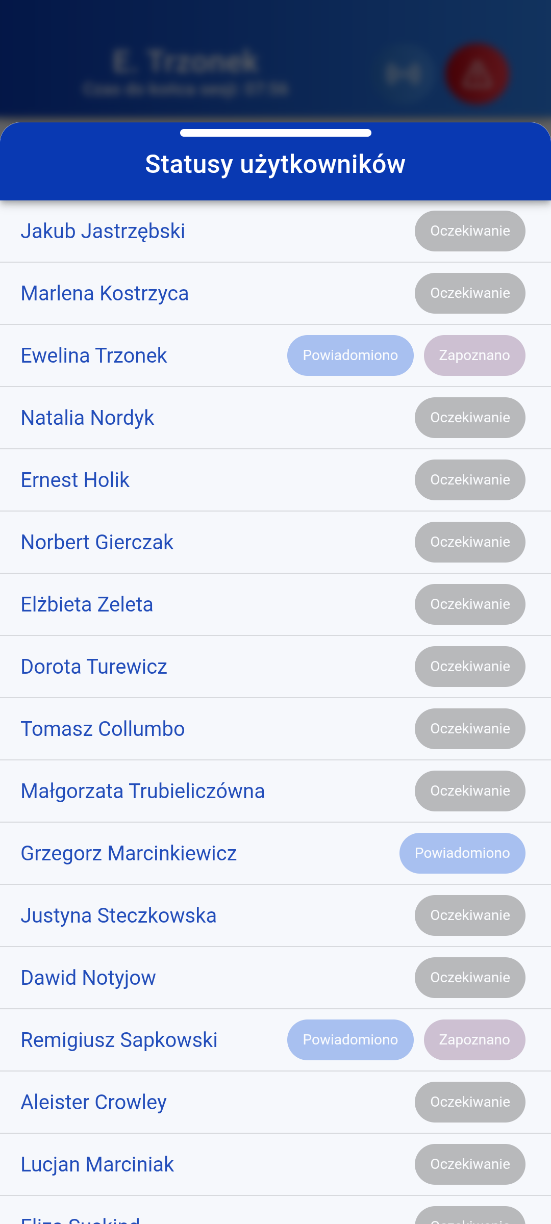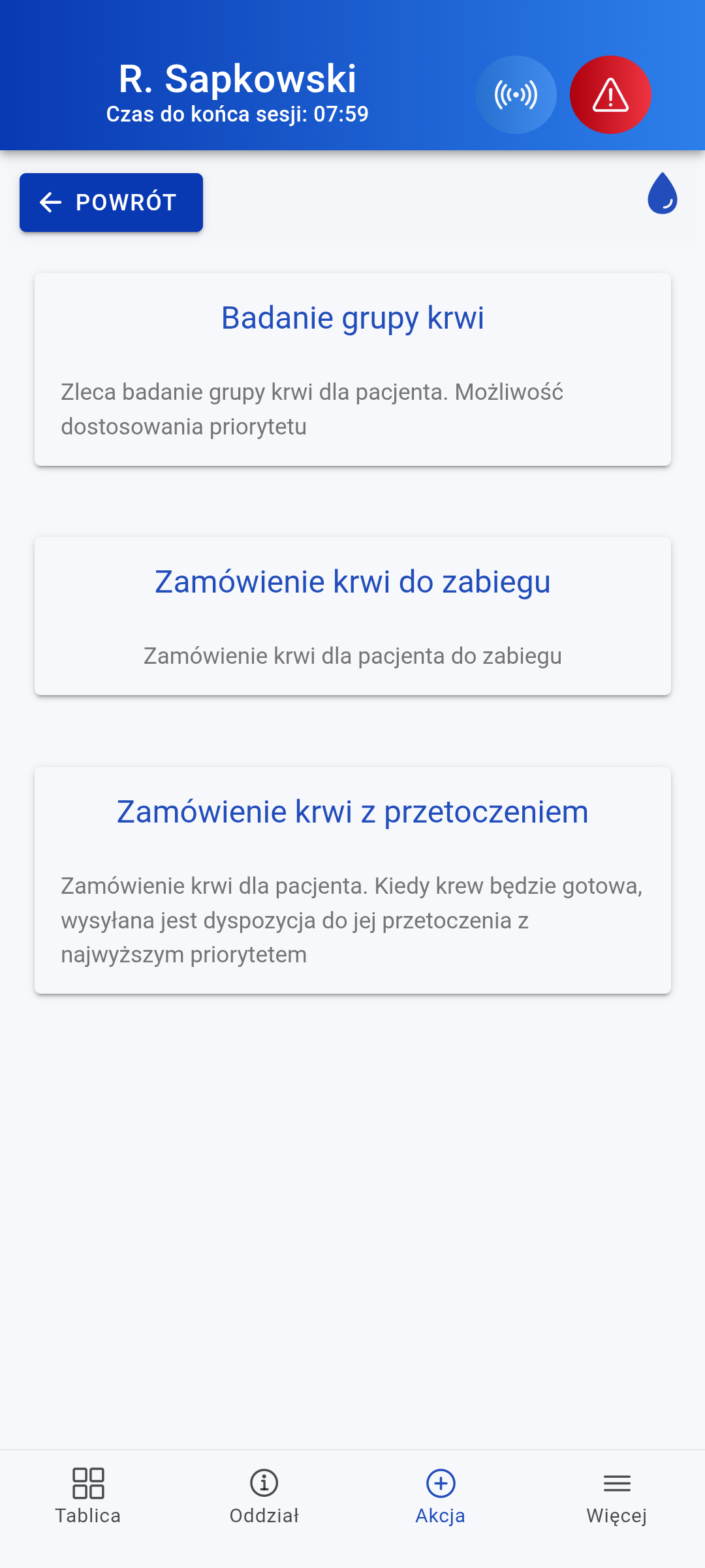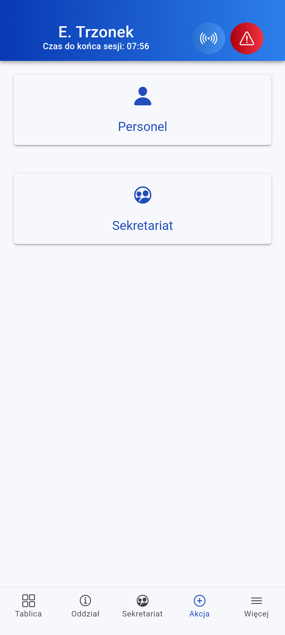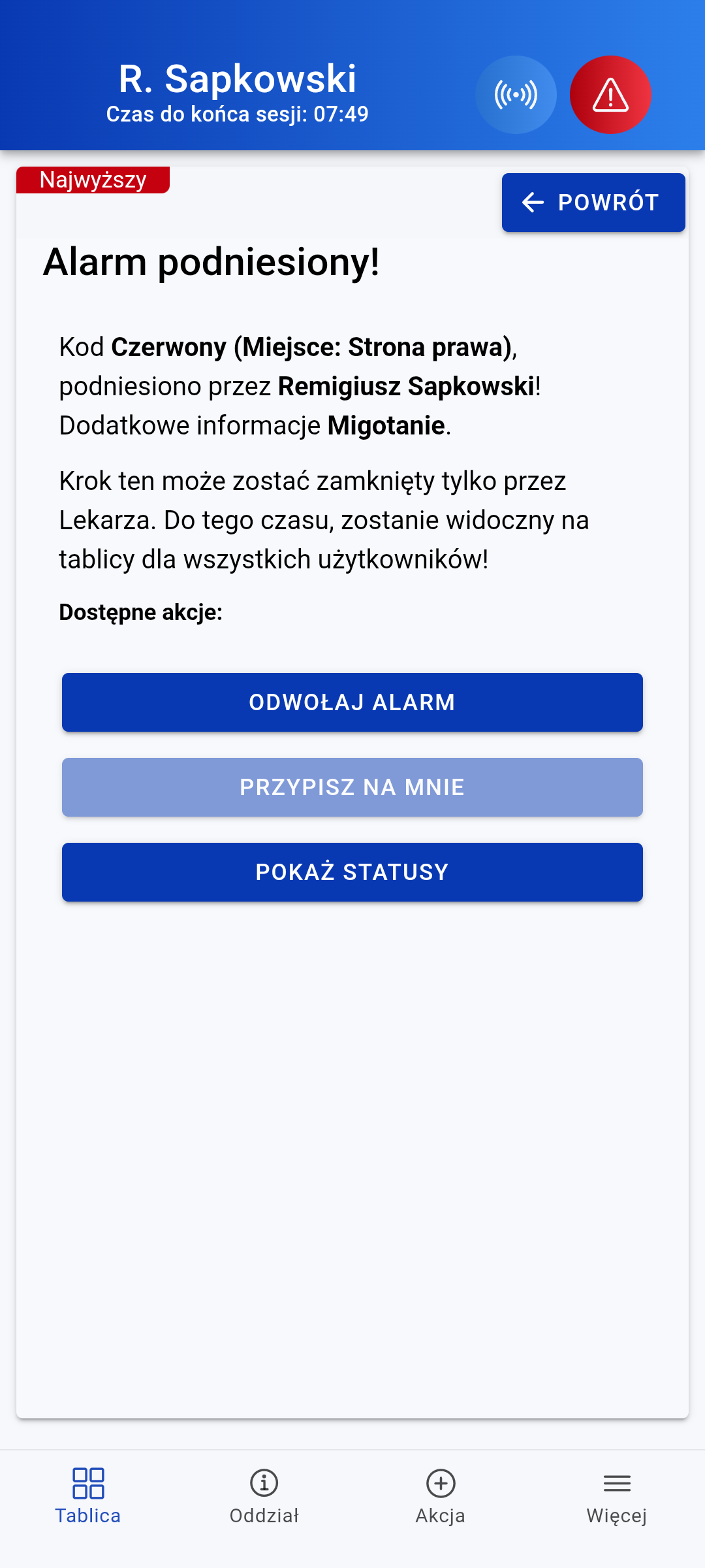 Alarm Niebieski wywołuje się dla zagrożenia personelu, Czerwony dla pacjenta. Wszyscy użytkownicy systemu otrzymują powiadomienie natychmiast. System automatycznie rejestruje, kto był obecny w systemie w momencie wystawienia alarmu, umożliwiając śledzenie odpowiedzi personelu. Każdy alarm jest archiwizowany w historii, dostępnej do późniejszego przeglądu i analizy. Platforma dostarcza szczegółową analitykę alarmów, obejmującą czasy odpowiedzi, częstotliwość incydentów oraz trendy bezpieczeństwa.